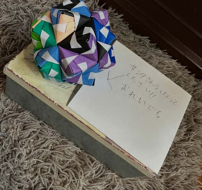 「サンタさんうけとってください!!おれいです。」と書かれた紙の横に、紫や青、黒などクールな色の折り紙で作られた“くす玉”が置かれています。缶の縦幅と同じぐらいの大きめサイズで作られていて、クオリティーの高さに驚きです。手作りしたアイテムでサンタさんにお礼をするなんて、なんとも優しい心の持ち主ですね♪