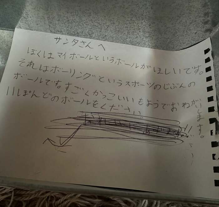 まずは、缶の中に入れられたサンタさんへのお手紙を見ると「ぼくはマイボールというボールがほしいです。それはボーリングというスポーツのじぶんのボールです。」と一生懸命に文字がつづられています。「すごくかっこいいもようでおねがいします。」と、こだわりもあるようです。