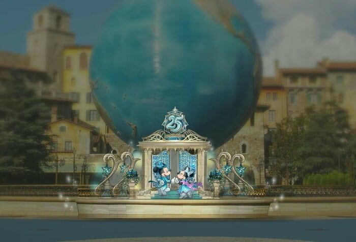 ゲストが入園後、最初に目にする東京ディズニーシーのシンボル「ディズニーシー・アクアスフィア」の前には、25周年のロゴとミッキーマウス、ミニーマウスのデコレーションが設置されます。