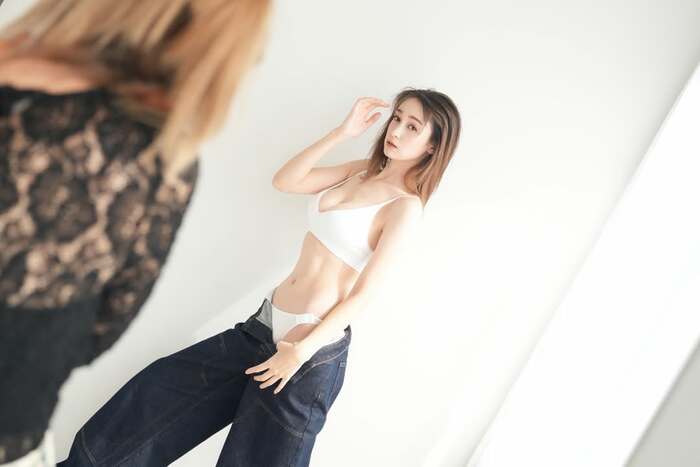 そして別のショットでは白いランジェリーを着用し、濃紺のゆったりとしたジーンズを引き下げるようなポーズで髪をかきあげているような瞬間の姿を披露。