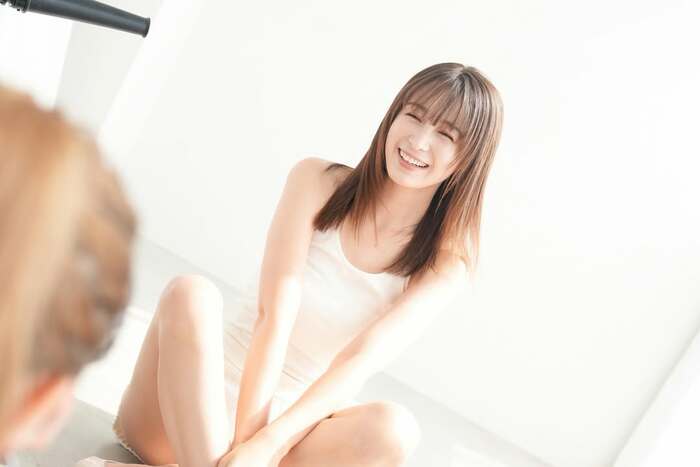 白いトップスを身につけ、膝を前に抱えるような姿勢で、楽しげな明るい笑顔をこちらに向けています。