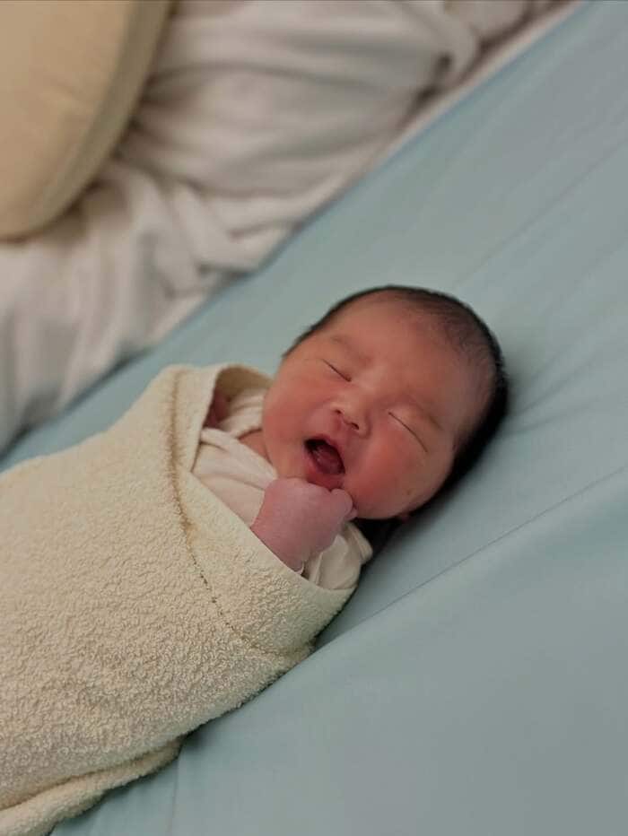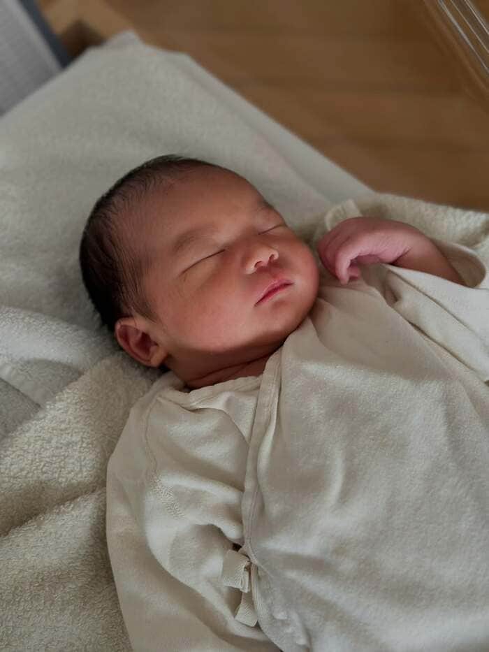 投稿には、生まれたばかりの赤ちゃんの写真が複数枚アップされています。白い毛布に包まれ、穏やかな表情で眠る姿や…