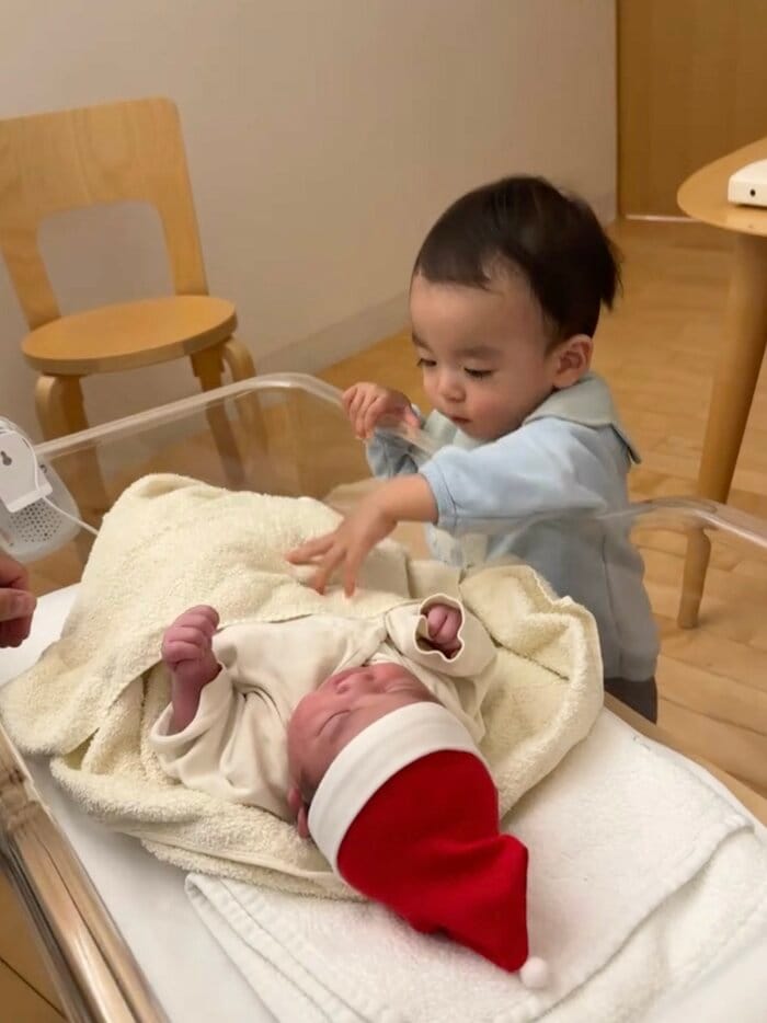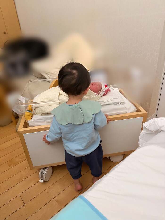 透明なコットで眠る弟を、興味深そうに眺める長男の“ベビバーグ”の後ろ姿を写した写真と共に蜂谷さんは、“ベビバーグ”と生まれたばかりの弟との対面についても報告。