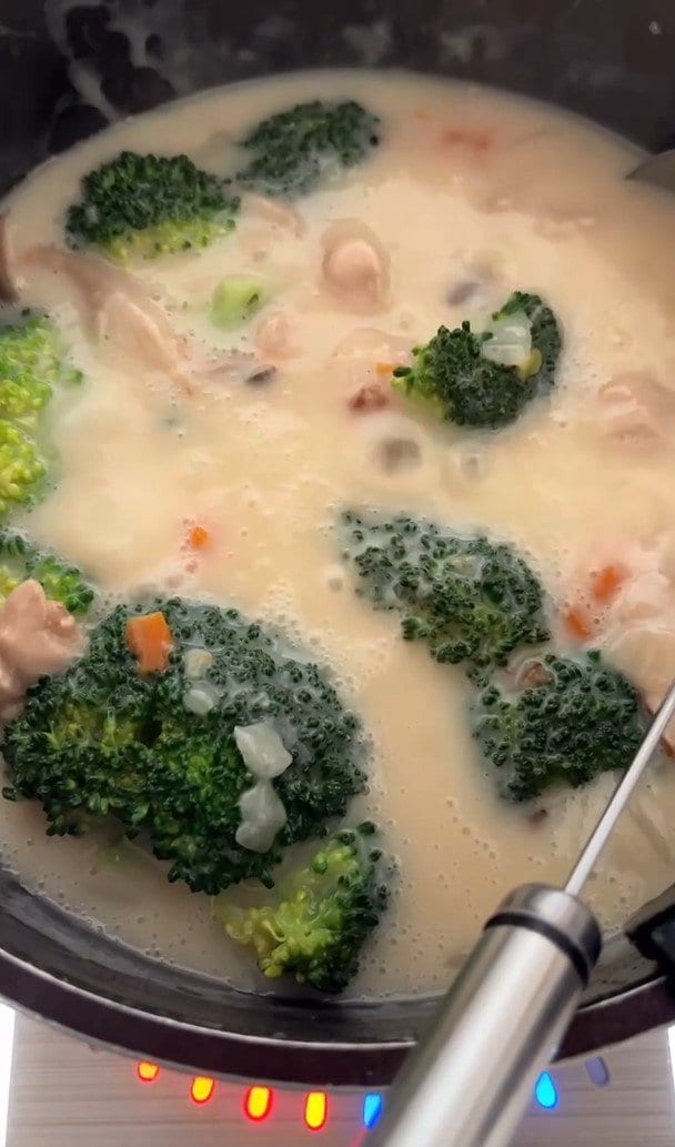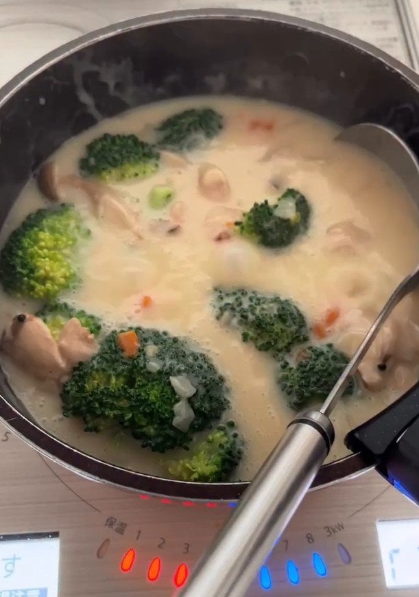 お鍋には、大きめにカットされたブロッコリーやにんじん、キノコ類などの具材がゴロゴロ。