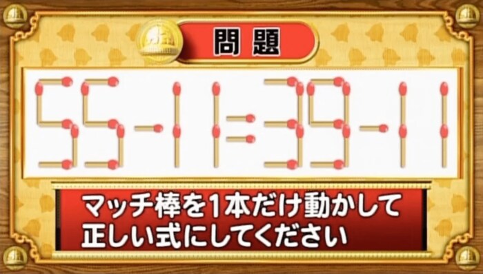 「55-11=39-11」。この式のマッチ棒を1本だけ動かして正しい式にしてください。