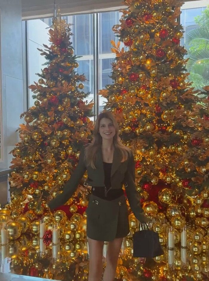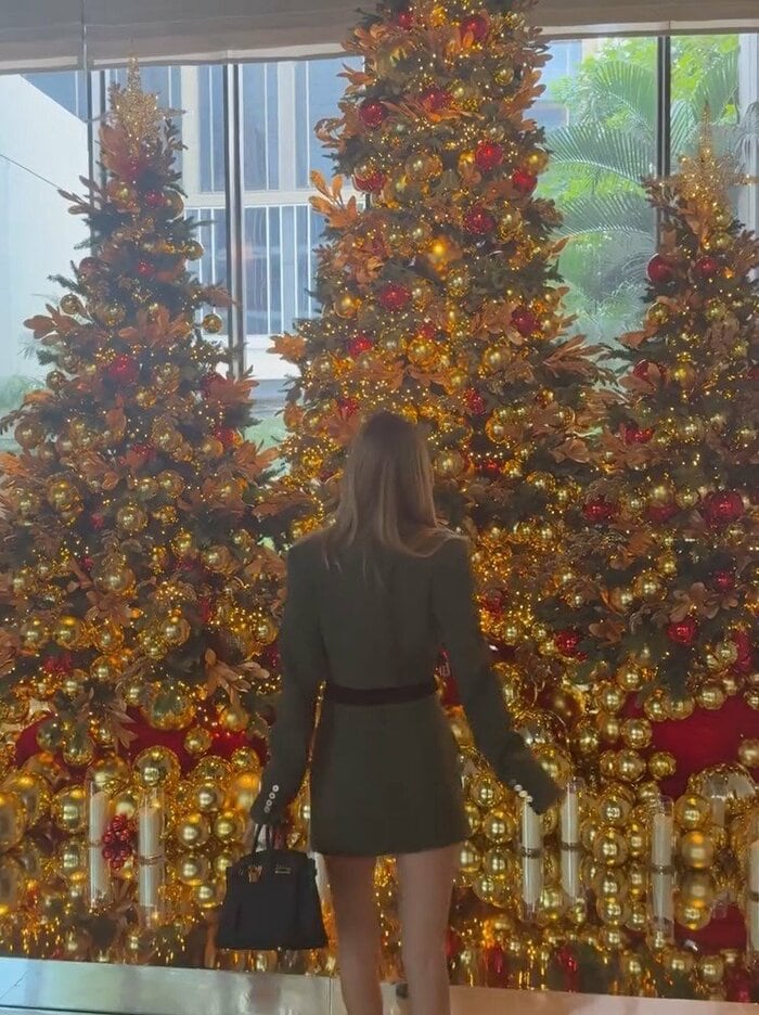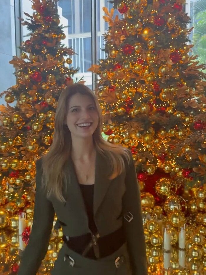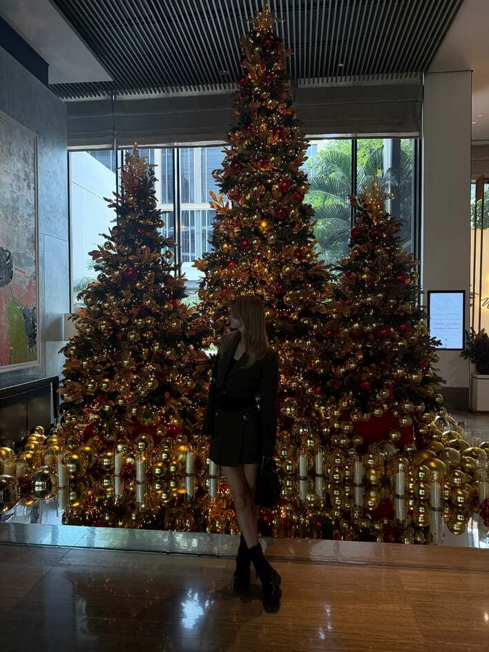 そこには、カーキ色のジャケットを羽織った、美脚際立つミニ丈コーデを着こなすマギーさんの姿が!ゴールドのオーナメントがふんだんに盛り付けられた大きなツリーをバックに、クールにポーズをきめています。