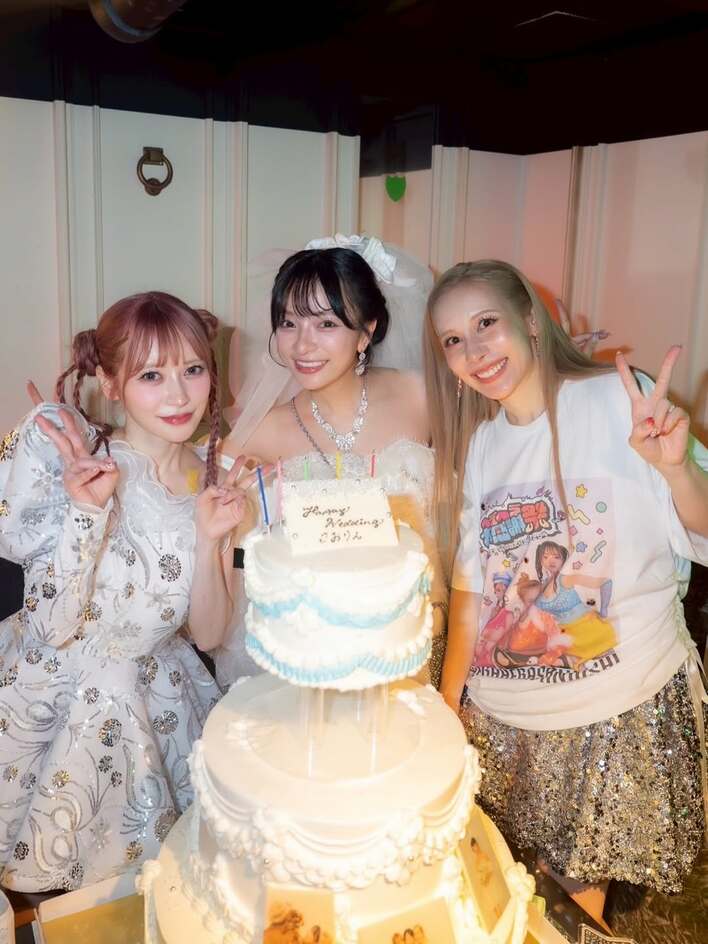 満面の笑みを浮かべる3人の前には、3段ある大きなセレモニーケーキが!「Happy Wedding さおりん」のプレートも飾られています。