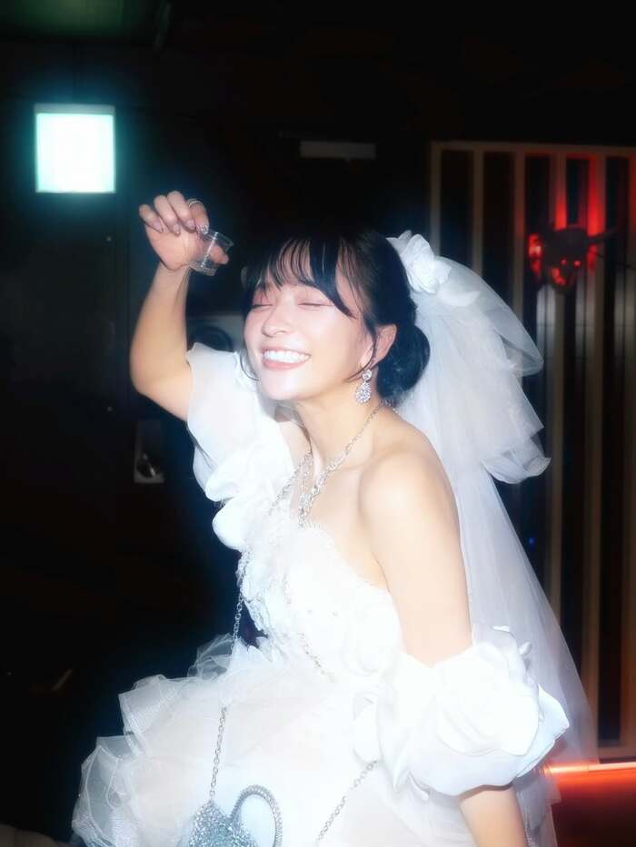 純白ミニ丈ドレスで乾杯!幸せあふれる姿を披露しました。