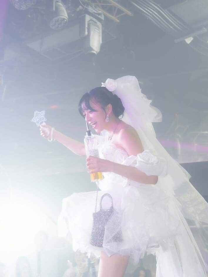 ふんわりフリルがかわいらしい、純白のミニ丈ドレス姿のさおりんさんは、ほっそりとした美脚をのぞかせています。胸元のキラキラしたビジュー装飾に、後ろに伸びた長いベールも素敵です!