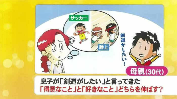 子どもの可能性を伸ばすために親がどう関わるべきかという話題では、「足の速い息子が剣道を習いたいと言うのだが、親としては足の速さを生かせるスポーツをやってほしい。どうするべき?」という30代女性の悩みが紹介された。