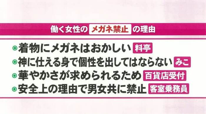 実際、CAは「安全上の理由から」、料亭では「着物と合わないから」など、様々な理由でメガネが禁止されているという。しかしスタジオでは、「メガネは顔の一部なのだから、禁止する意味がわからない」というトークの流れに。