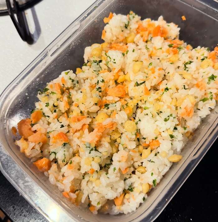 さらに、「朝は混ぜ込みおにぎりに 天かすと青のりらへんを共にギュッと」と、朝ご飯はほぐした焼き鮭を使い、おにぎりを作ったという西山さん。