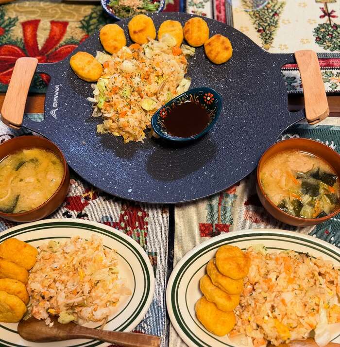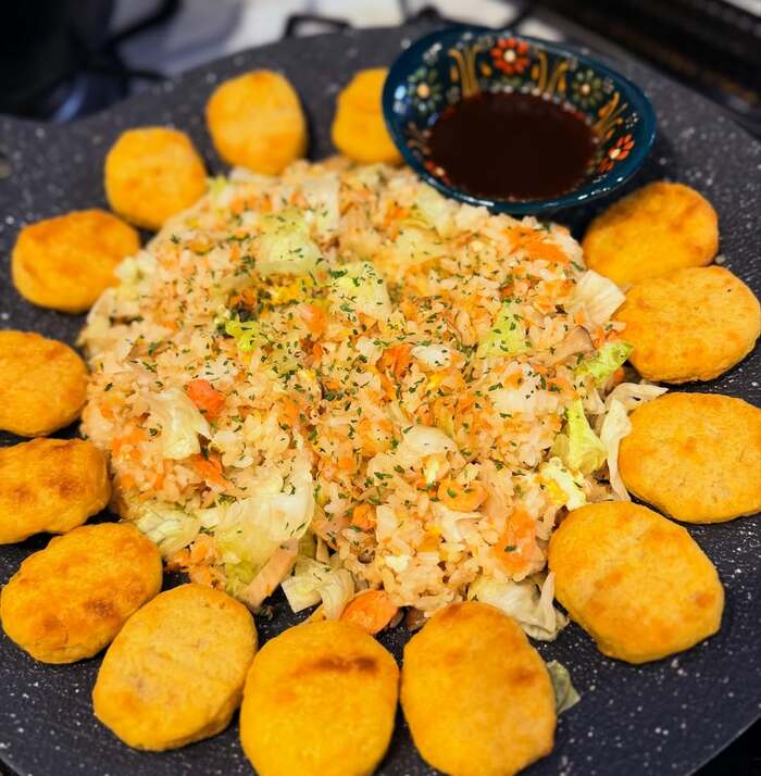 大皿の中心に、形を整えた炒飯をよそい、周りには「焼くだけナゲット」も。