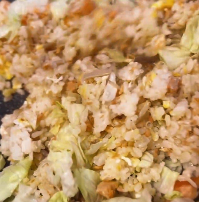 そこに、白米、レタスを加えて、全体的に混ぜ合わせると…