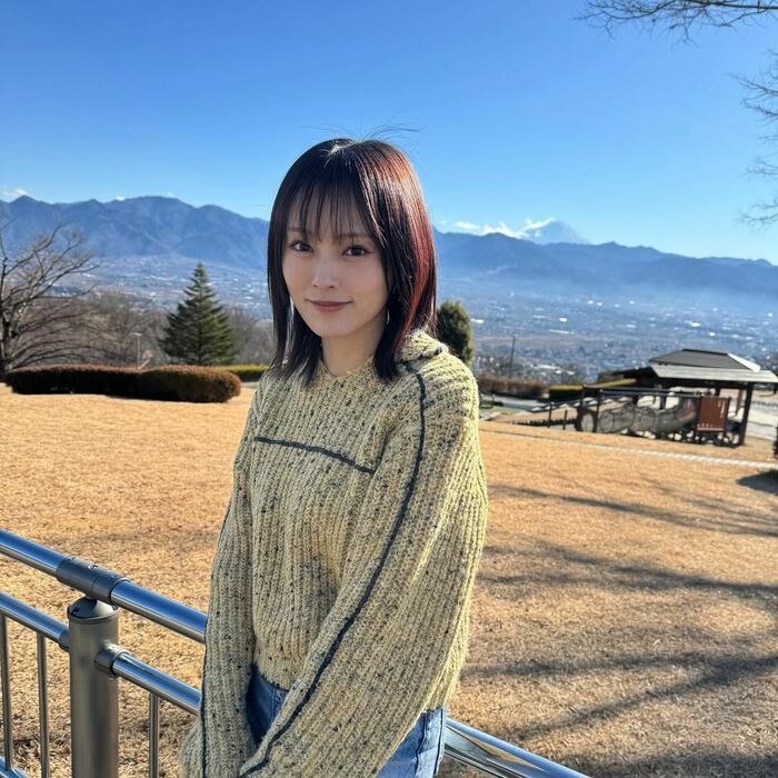 公開された写真には、黄色のニットにデニムパンツを合わせたコーディネートで、山梨にある遠くに富士山が見える公園でカメラに向けてほほ笑む山本さんの姿が!