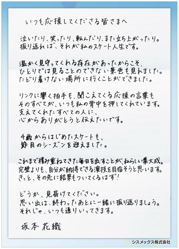 <坂本花織選手 直筆の手紙より>