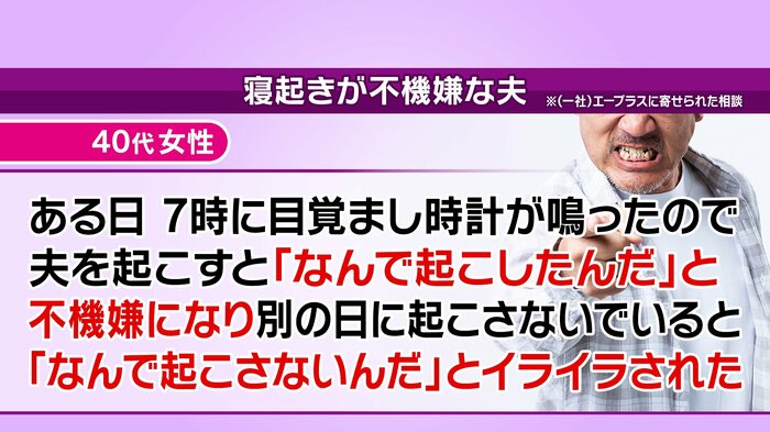 「7時に目覚ましが鳴ったから夫を起こしたら不機嫌になり、別の日には起こさずにいたらイライラされた」という、40代女性のエピソードも紹介されました。