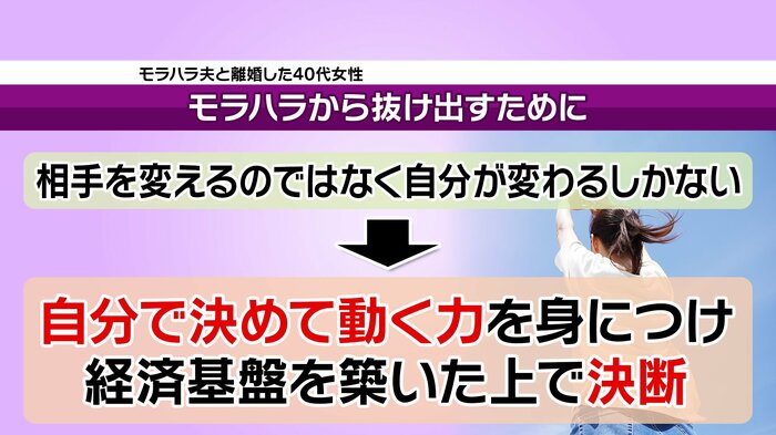 約10年の結婚生活の末にモラハラ夫と離婚した40代の女性は、持ち物や携帯電話のチェック、外出の制限などによって追い詰められ、ネットで検索した結果、自分が受けているのが「モラハラ」だと自覚。支援団体に相談して夫も変わる努力はしてくれたそうですが、自分が変わるしかないと離婚に踏み切ったといいます。