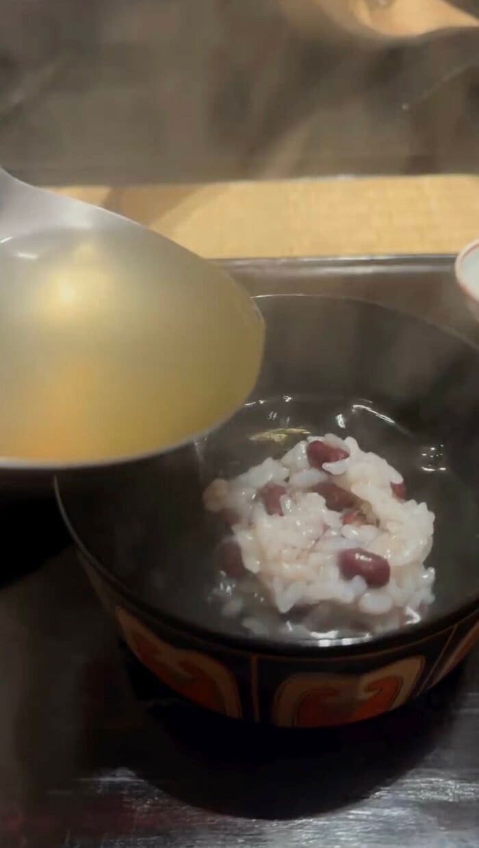 まず登場した黒いお椀は“冬至粥”。小豆入りのご飯に黄金色の出汁を注いでいただく一品です。