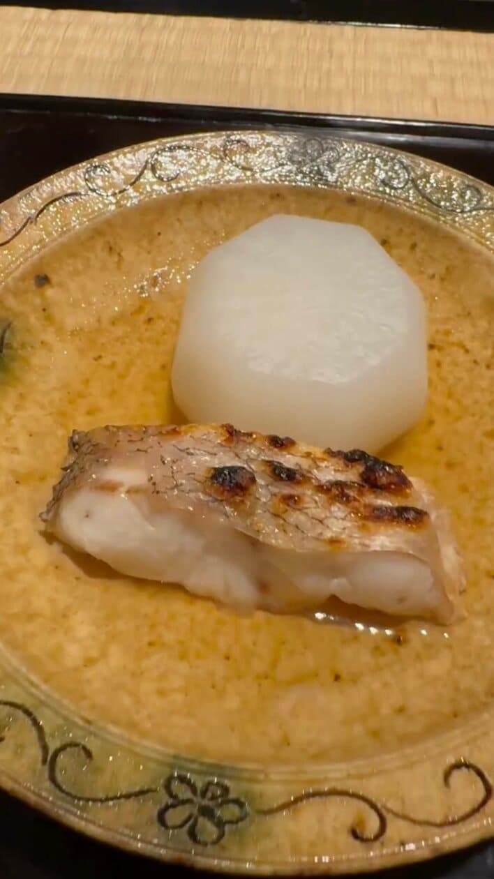 そしてこの日のメインでしょうか。花模様の美しい皿に丁寧に盛り付けられているのは香ばしい焼き色のついた白身魚と、厚切りの煮大根。魚の身のふっくらとした見た目とパリッと香ばしい皮目の食感が味わいに幅を持たせてくれそうな料理ですね。丁寧に炊かれた大根と一緒に食べればさらに感動が広がりそうです。