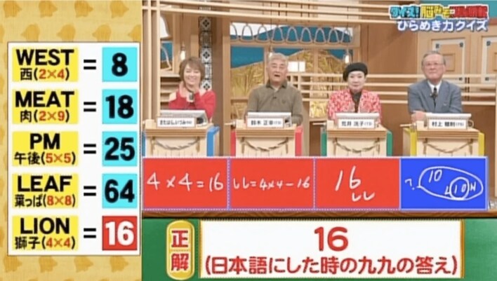 「WEST=8」「MEAT=18」「PM=25」「LEAF=64」「LION=[?]」。法則を見つけて「?」に入る数字を答えてください。