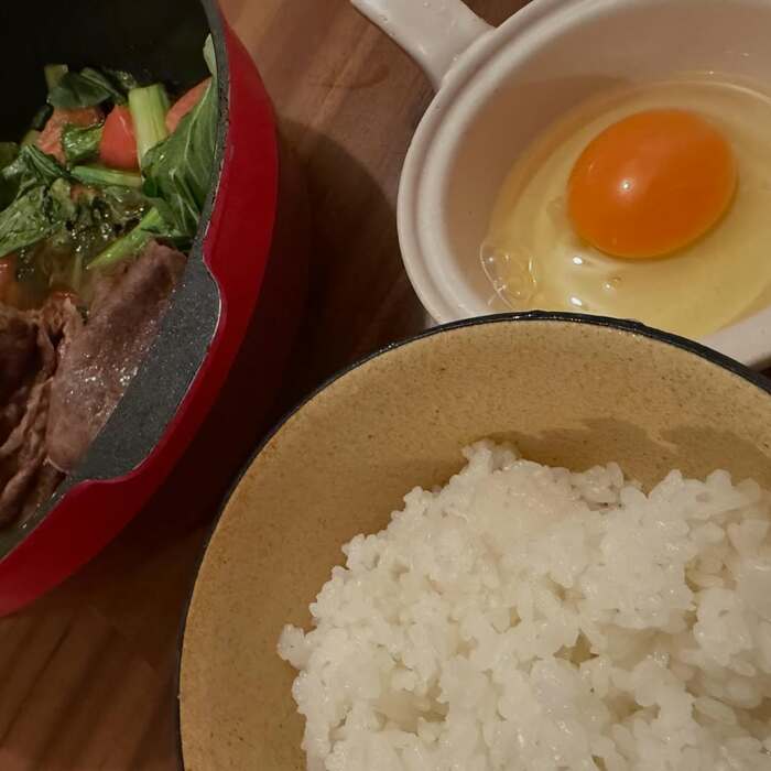 木製のテーブルの上には、一粒一粒が粒だった白米と具だくさんなすき焼き、そして黄金色をした生卵が並んでいて、見ているだけで食欲がそそられます。すき焼き鍋をのぞくと、野菜はくたっとするまでしっかりと煮込まれていて、大きなお肉はしっかりと味が染み込んでいるよう。特別な日のごはんにぴったりな豪華メニューはとってもおいしそうで、今にもおなかが鳴ってしまいそうです。