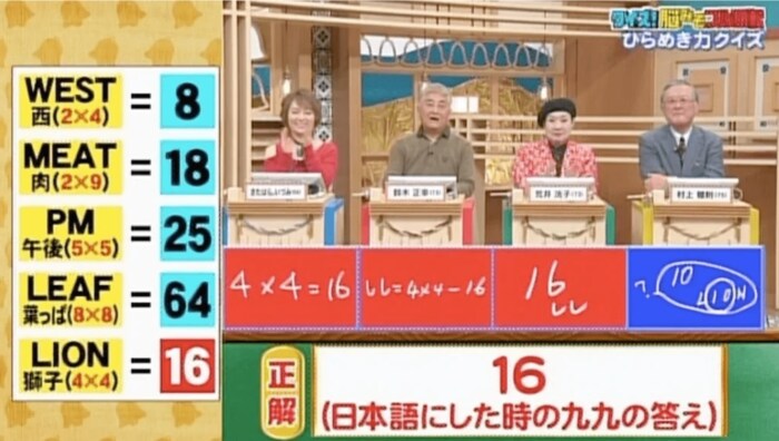 正解は「16(日本語にした時に、九九の答えになる/LION=獅子=しし=4×4=16)」。