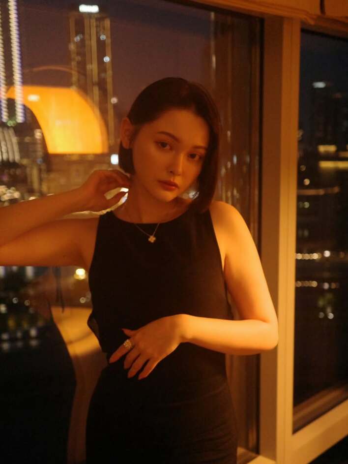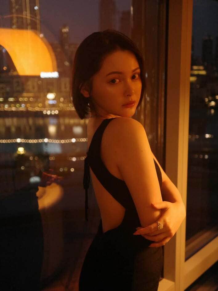 公開された写真を見てみると、ホテルの一室で撮影したのか、奥にはきれいな夜景が広がるガラス張りの窓の前で、ノースリーブの黒いドレス姿でたたずむ玉城さんの姿が。