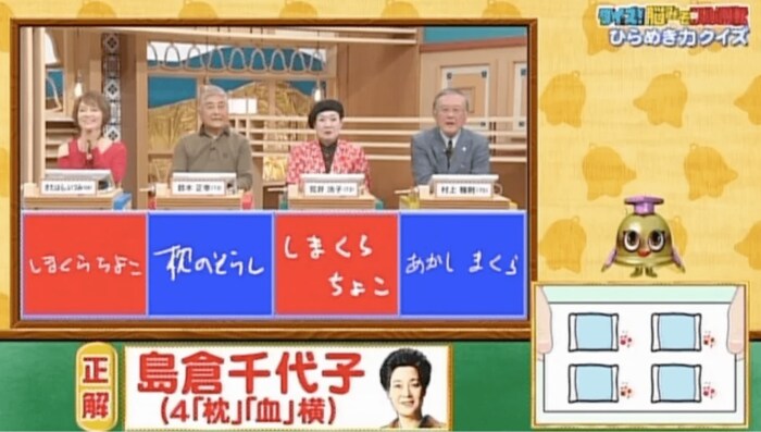 正解は「島倉千代子(4つの枕の横に血=しまくらちよこ)」。