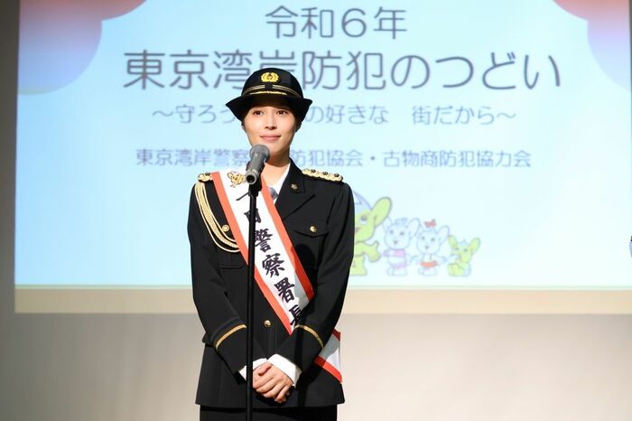 広瀬さんは、警察官の制服姿で有明教育芸術短期大学の多目的ホールに登場。東京湾岸警察署の山田学署長が「広瀬署長、よろしくお願いいたします」と述べると、広瀬は美しい敬礼で応えました。