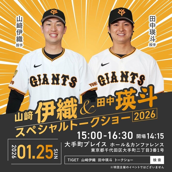 読売ジャイアンツ山崎伊織投手と田中瑛斗投手を迎えた特別イベント 「山崎伊織&田中瑛斗 スペシャルトークショー2026」が2026年1月25日(日)に開催されます。チケットはTIGETにて抽選受付中です。