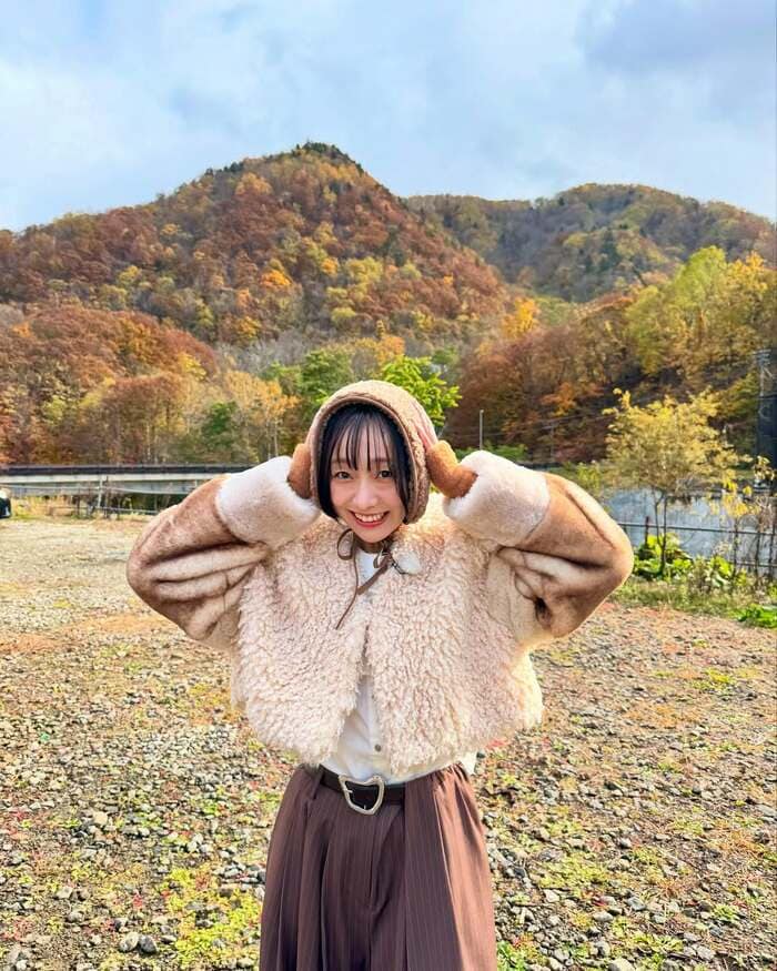 温泉以外にも、ロケを満喫するさまざまな表情を見せており、紅葉に染まる山々を背景にしたショットでは、ベージュのファーコートを着てフードを被り、両手で頭を挟むようなポーズをとっています。