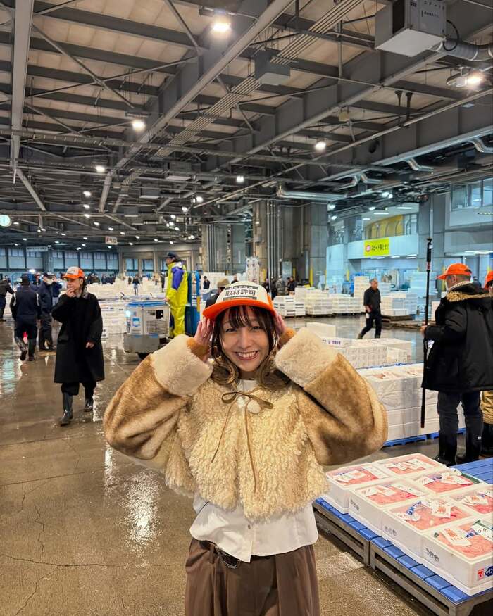 北海道といえば海産物ということで絶品グルメを調達するためやってきた市場では、「取材許可」と書かれたオレンジ色の帽子をかぶり、両手で帽子の縁をつかんで楽しそうな笑顔を見せています。