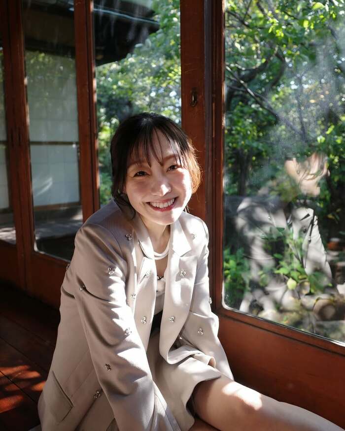 さらに木製の大きな窓枠がある室内では、ベージュのコートを羽織り、板張りの廊下に座り体を前に傾けて明るく幸福そうな笑顔を見せるショットも公開しました。