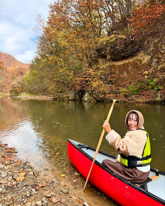 また川沿いでは、救命胴衣を着用し、赤いカヌーに乗るアクティブな姿を公開。長いパドルを手に持ち、嬉しそうに笑う姿も。