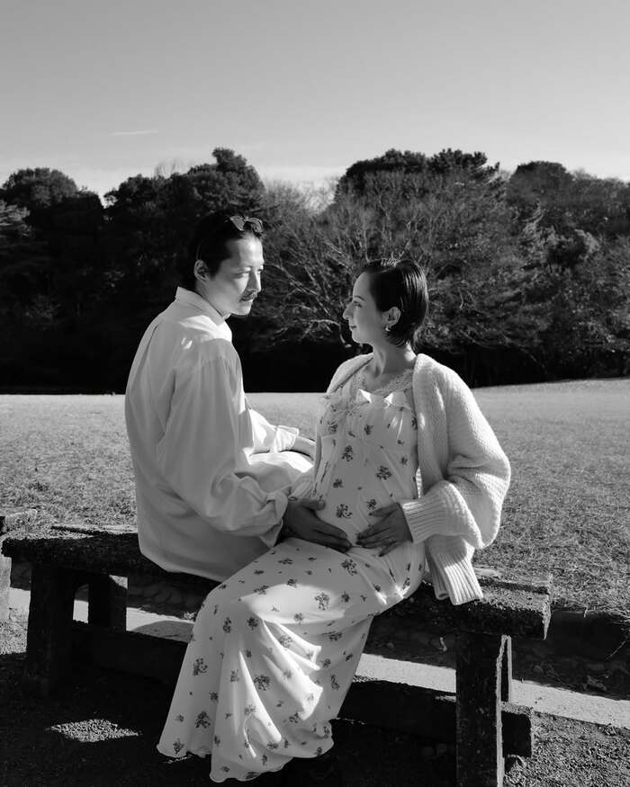 モノクロの写真では、公園の広い芝生に置かれたベンチに二人が腰を下ろし、大きくなったお腹を互いの手で優しく支えながら、愛情に満ちた表情で見つめ合っています。
