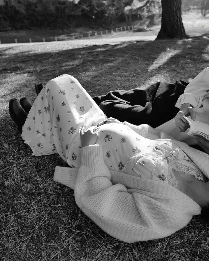 さらに公園のベンチでは、Juliaさんが読書をするこうへいさんに膝枕をしてもらいながら横になる親密な様子のショットも公開されています。よく見ると、本を持つ手と別のほうの手はJuliaさんの手をギュッと握っています。