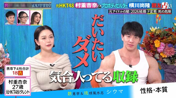 12月21日放送の『突然ですが占ってもいいですか?』は、“親友占い”として村重杏奈さんと横川尚隆さんがシウマさんに占われました。