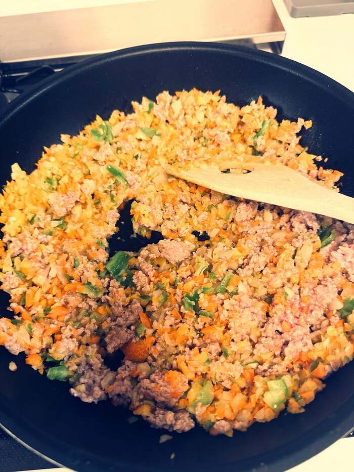 ひき肉とご飯を混ぜ合わせている途中のようです。