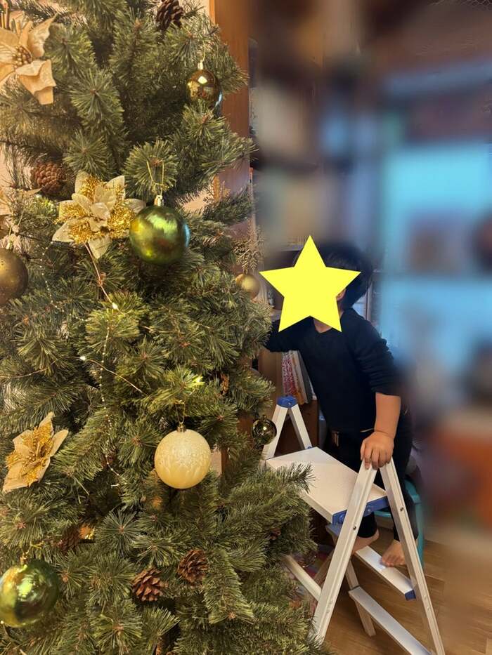 公開された写真には、オーナメントが飾られたツリーの横で、脚立を使って飾り付けをする長男の姿が。写真に収まりきらないぐらいの大きなツリーだったようで、見ているだけでテンションが高まります。