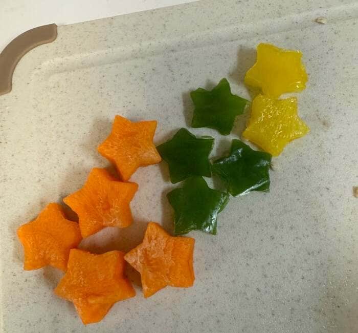 また、お子さん用に作ったのでしょうか、かわいらしい星型にくりぬかれたにんじん、ピーマン、パプリカを収めた写真も公開。カレーを食べている際に星型を見つけ、笑顔を浮かべる子ども達の姿が想像できます。