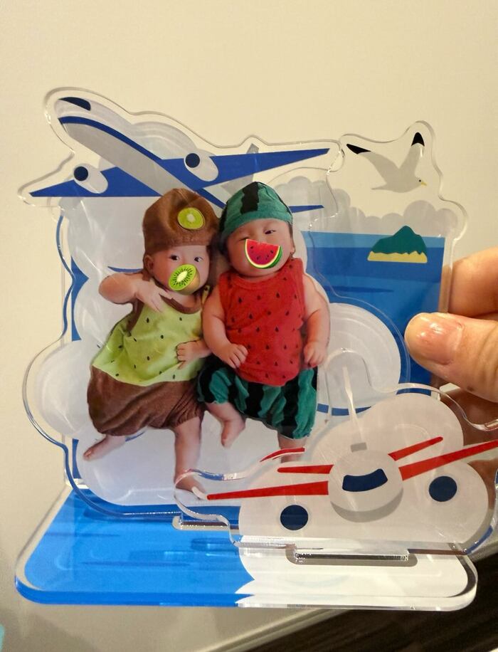 「アクスタ二つ目作っちゃった!」と、スイカコーデのお兄ちゃんとキウイコーデの弟くんが寄り添ったショットをアクリルスタンドにしたことを報告。