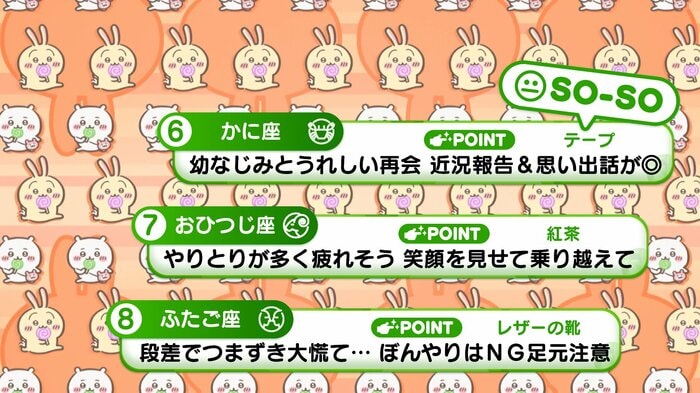 『めざましテレビ』で放送中の「ちいかわ占い」 テレビ放送がない日はお休みで、月~土:朝7時以降に更新予定です。