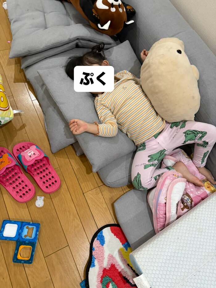 「遊んでる途中で寝たらしい笑」とつづられた1枚目のショットでは、机に伏せて居眠りしている“ぷくぷくちゃん”の姿が。