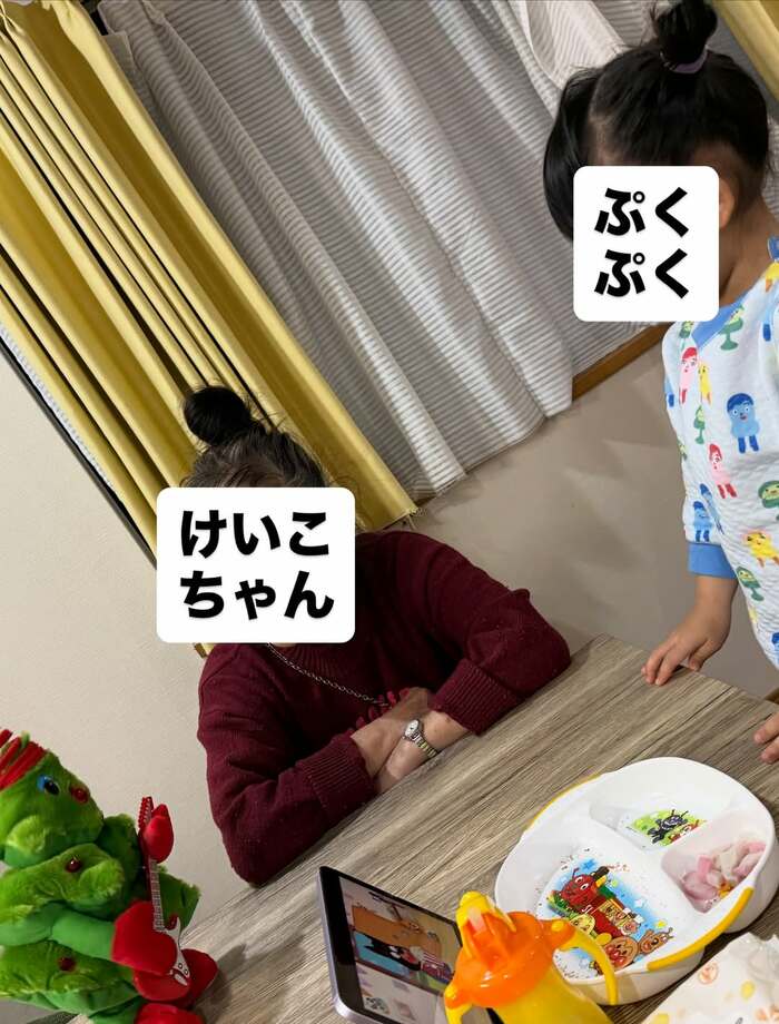 最後は、丸山さんの母と“ぷくぷくちゃん”が、テーブルを囲んでいる1枚。