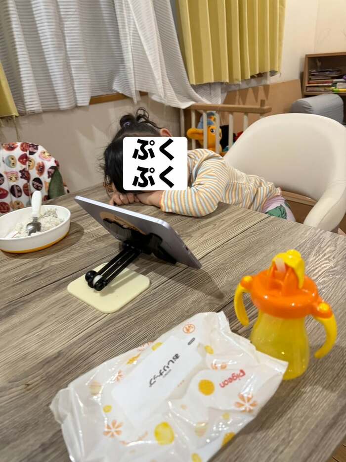 前に置かれたタブレットで遊んでいた最中に寝落ちしてしまったようです。