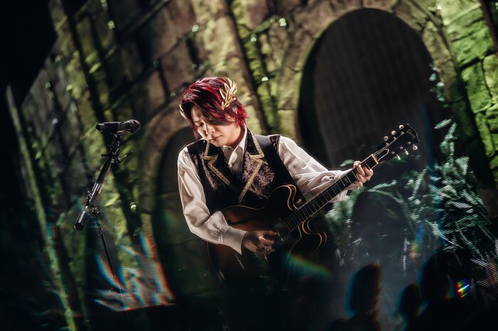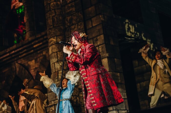 塔の上で王のような赤いマントを身につけた彼が歌うのは「絶世生物」。レーザーライトが迸り、重厚なサウンドが地響きのように東京ドームを揺らします。人の上に立った人が力を誇示するようなその存在感が、先ほどまでののどかな世界を一変させてしまいます。そして雷鳴が轟き、気がつくと塔が客席のほうに大きく迫り出していました。その巨大な仕掛けにも驚きますが、それ以上にステージから鳴らされる「Ke-Mo Sah-Bee」の音と大森さんのパフォーマンスに目を奪われます。