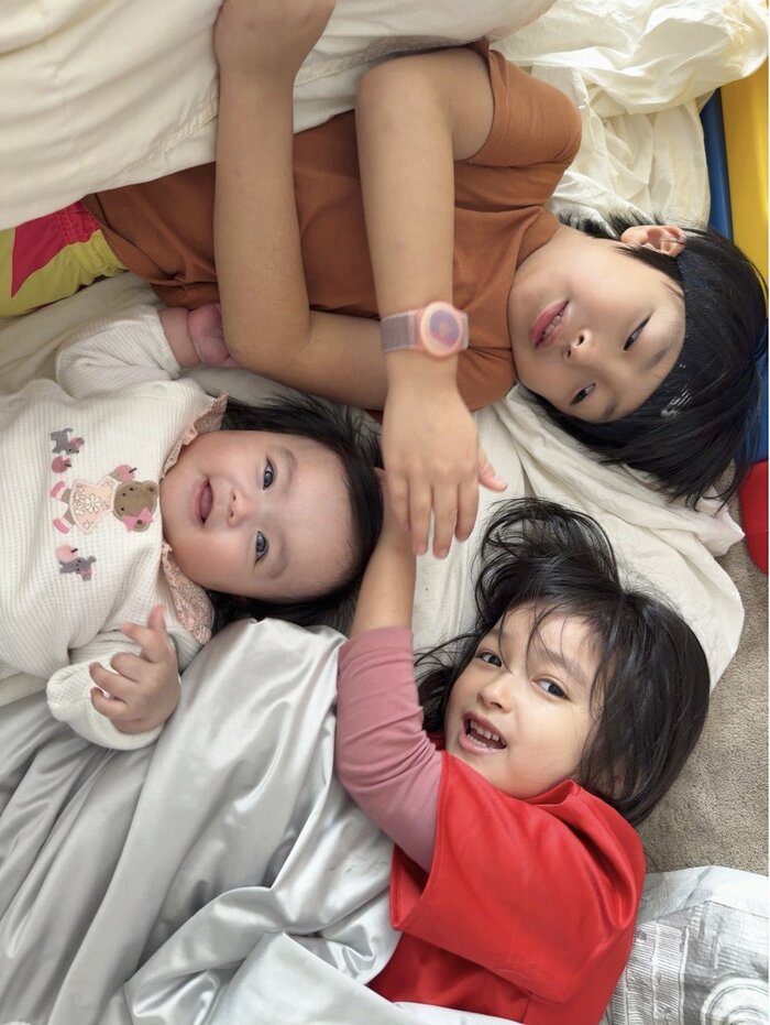 公開された写真には、長男・カゲトラくんと、長女・美人ちゃん、そして生後5ヵ月の次女・ググガガちゃんの3人が、布団の上で仲良く寝転がっている姿が写っています。