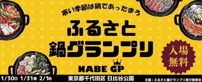 2026年1月30日(金)~2月1日(日)の3日間、東京都千代田区 日比谷公園にて『ふるさと鍋グランプリ(R)2026 in日比谷公園』を開催いたします。冬の風物詩"鍋"を題材にしたフードフェスティバルです。旬の魚や野菜、肉などを使った各地域の鍋が大集合。来場者の投票でグランプリが決まる「鍋グランプリ」を実施。アツイ戦いが繰り広げられます。さらに、全国の日本酒を利き酒できる「ご当地酒蔵めぐり」もご用意。食べて飲んで楽しめるイベントです。