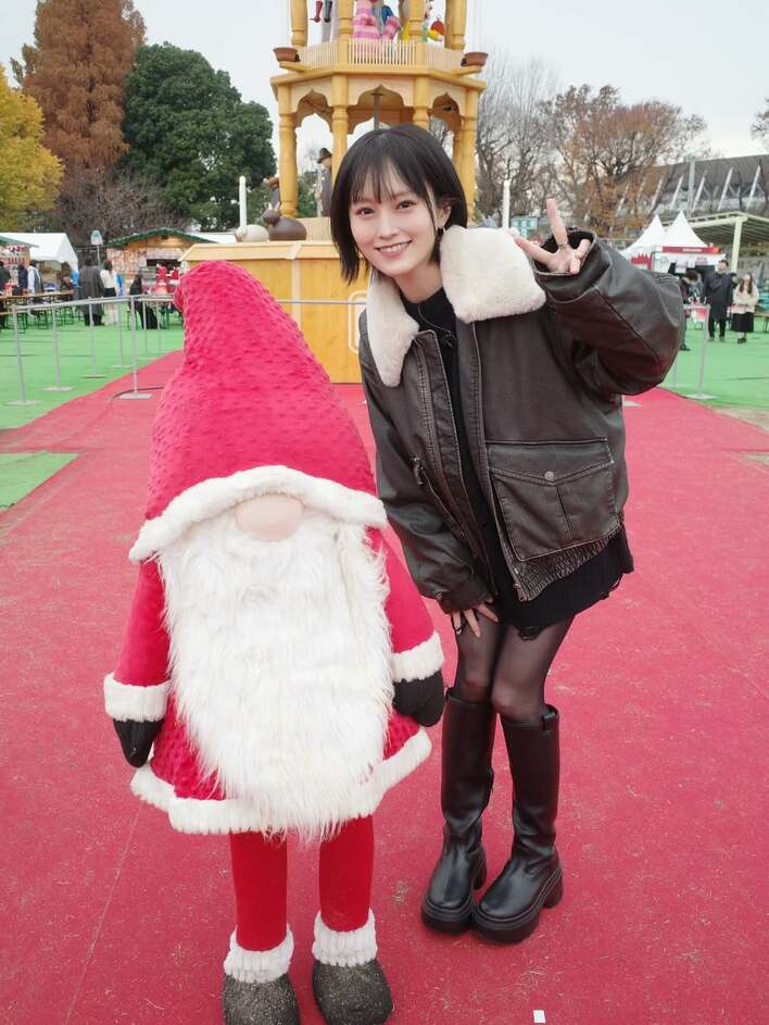 別の写真では、サンタの人形の隣でVサインをしながら微笑む可愛らしい姿も披露。